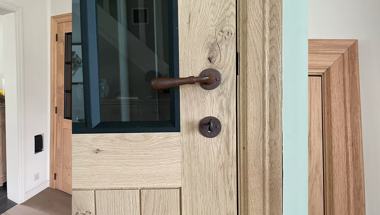 Breadcrumb Realisaties Project TA - Wingene Project TA - Wingene Volmassieve eiken binnendeur. Materiaal: eik / zacht rustiek / glad geschuurd / Ophelmat steellook binnenkader voorzien in hout zwart gekleurd deurgarnituur elegeance roest