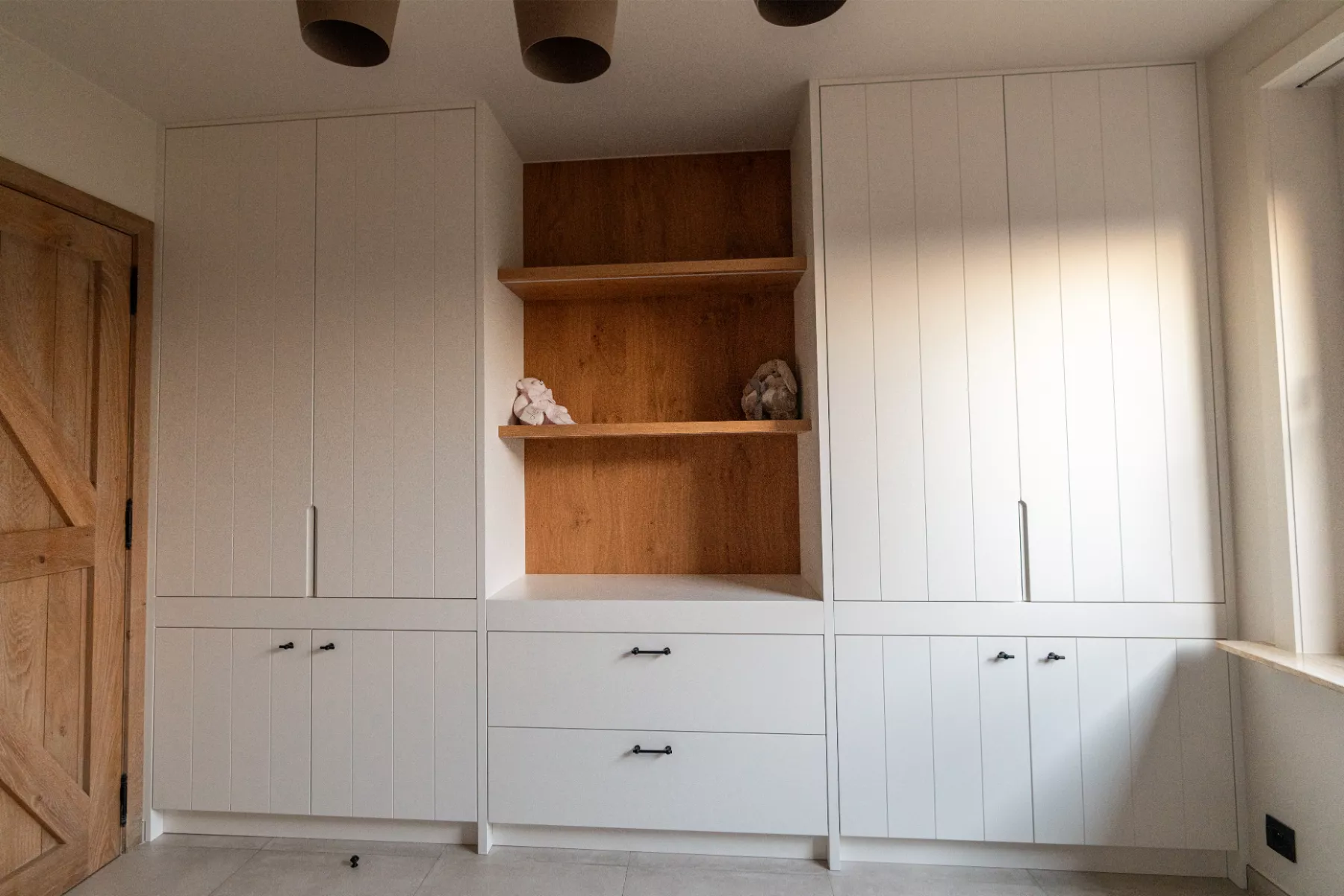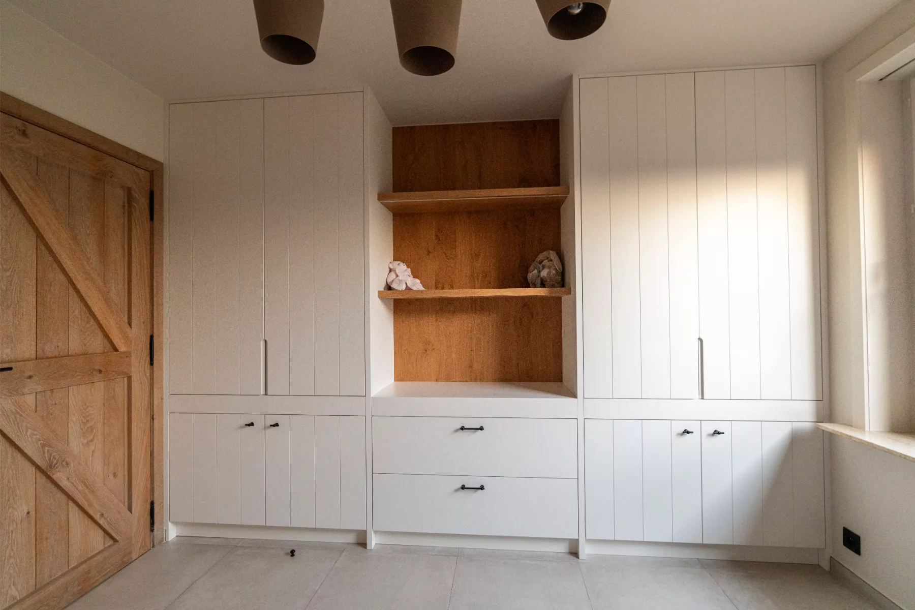 Een warme toets werd toegevoegd met eikfineer aan de binnenzijde van de open nissen, wat zorgt voor een natuurlijk accent en een stijlvol contrast met het witte lakwerk.
