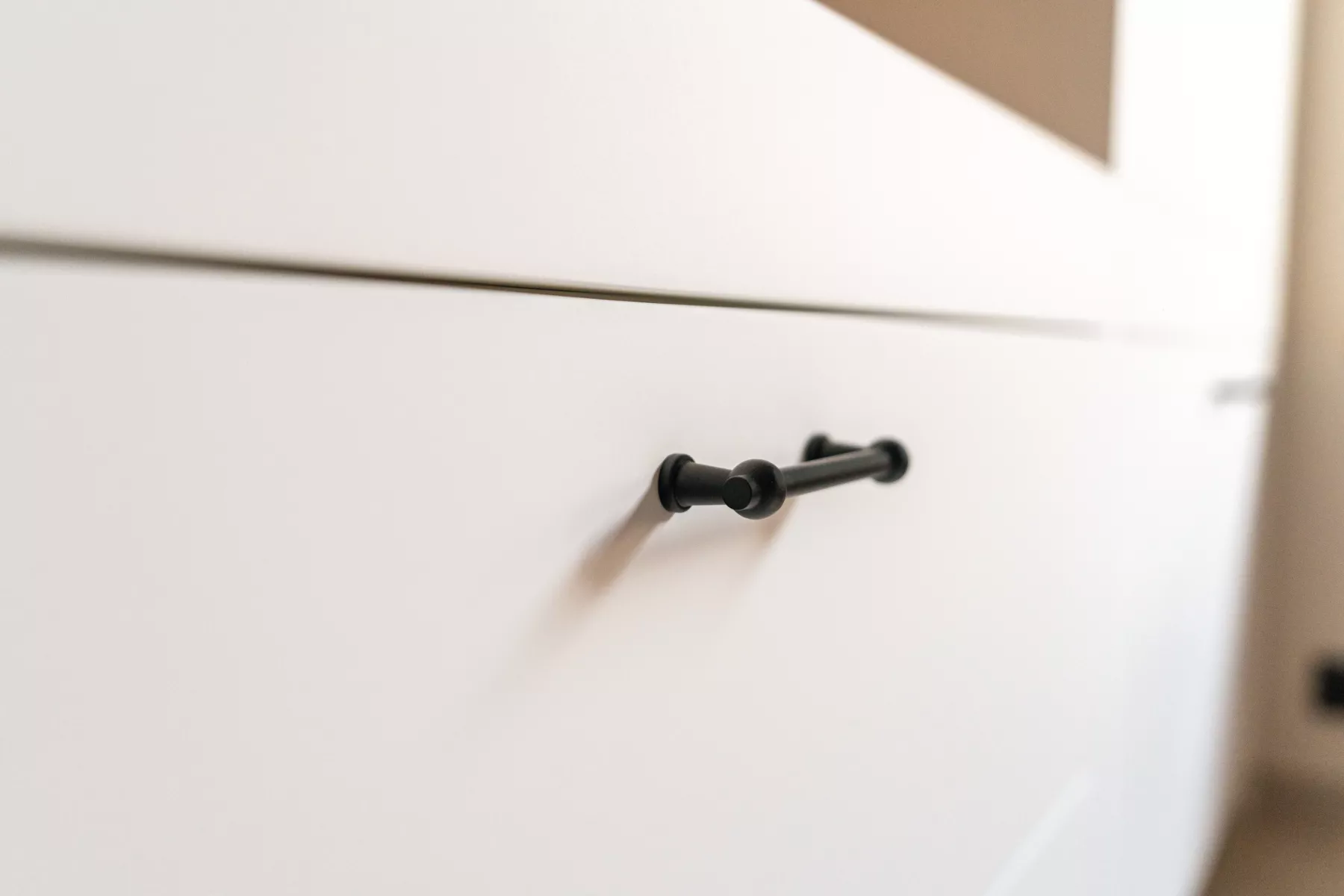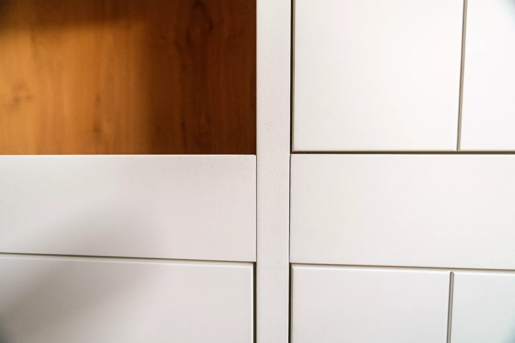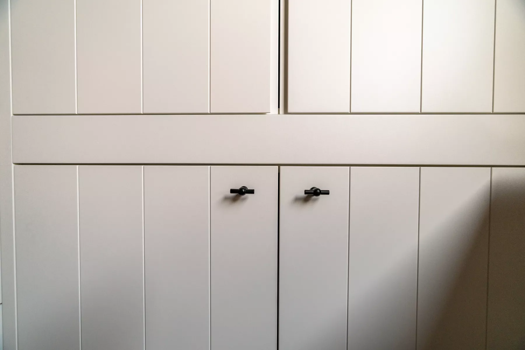 De kasten zijn afgewerkt met fronten in microstructuurlak, wat zorgt voor een elegante, matte structuur die tegelijk zacht aanvoelt en bijzonder onderhoudsvriendelijk is.