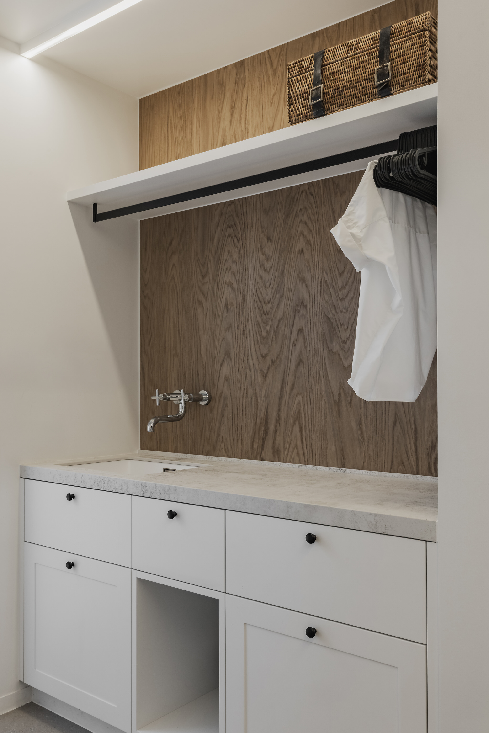 Met doorlopende led-lichtlijnen onder de schappen en boven de kasten creëren we een subtiele, warme gloed die extra sfeer en ruimtelijke diepte brengt – zelfs in de meest functionele ruimtes van een woning. Slimme opbergmodules, uitneembare manden en een ergonomische werkzone maken van de waskamer een plek die niet alleen praktisch klopt, maar ook rust en gebruikscomfort toevoegt aan het dagelijkse ritme.